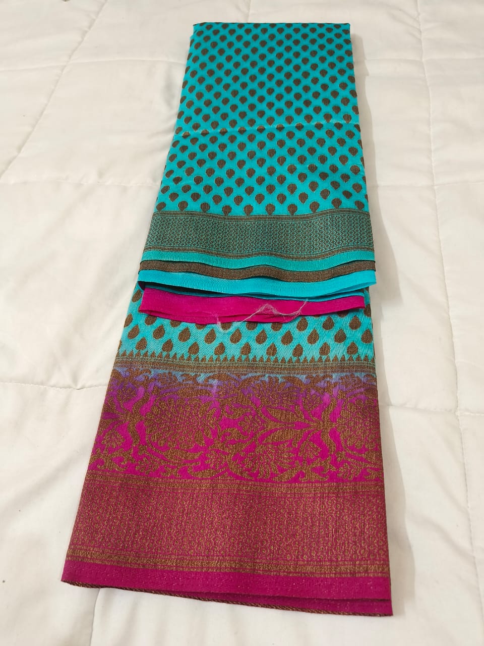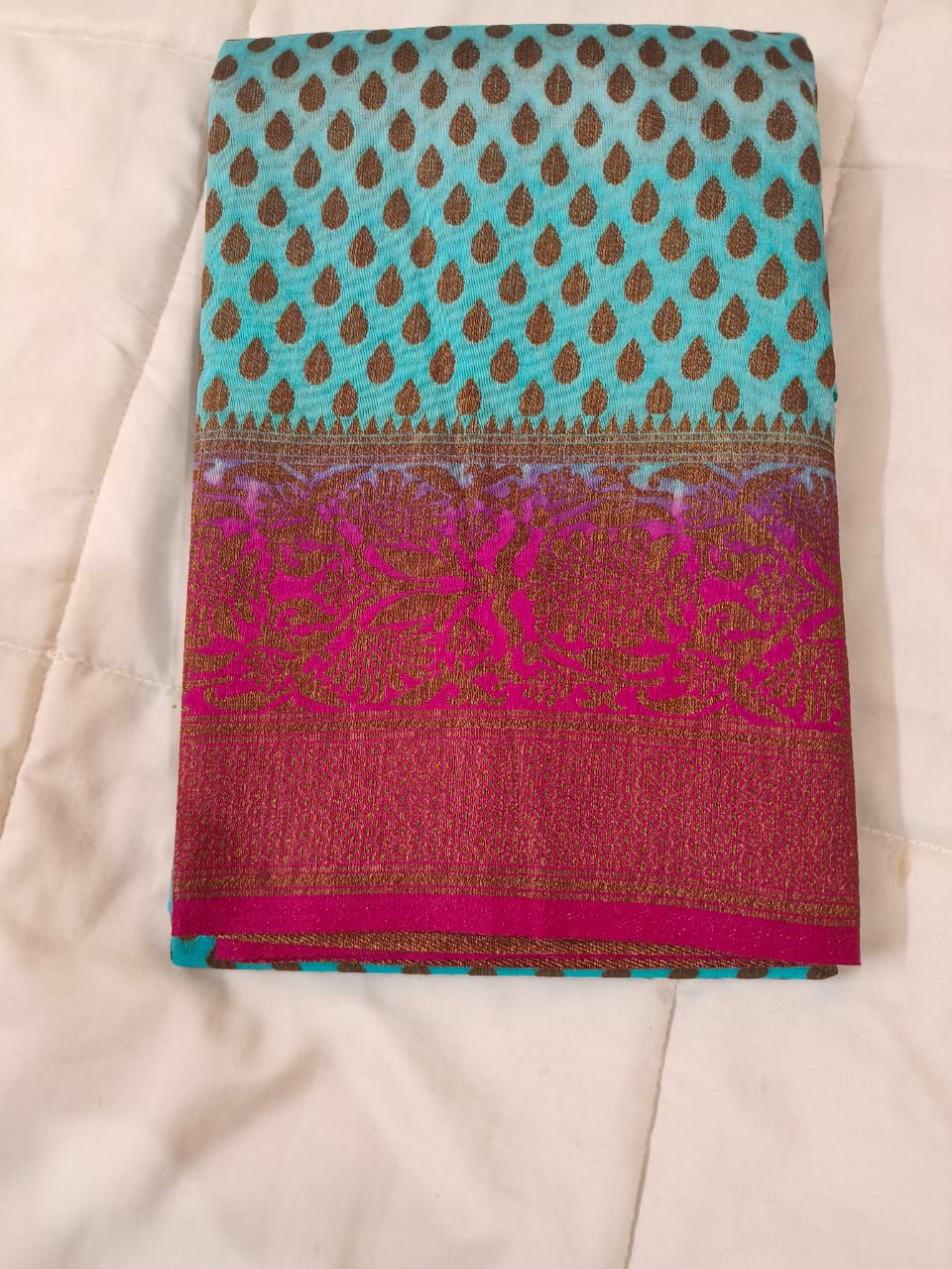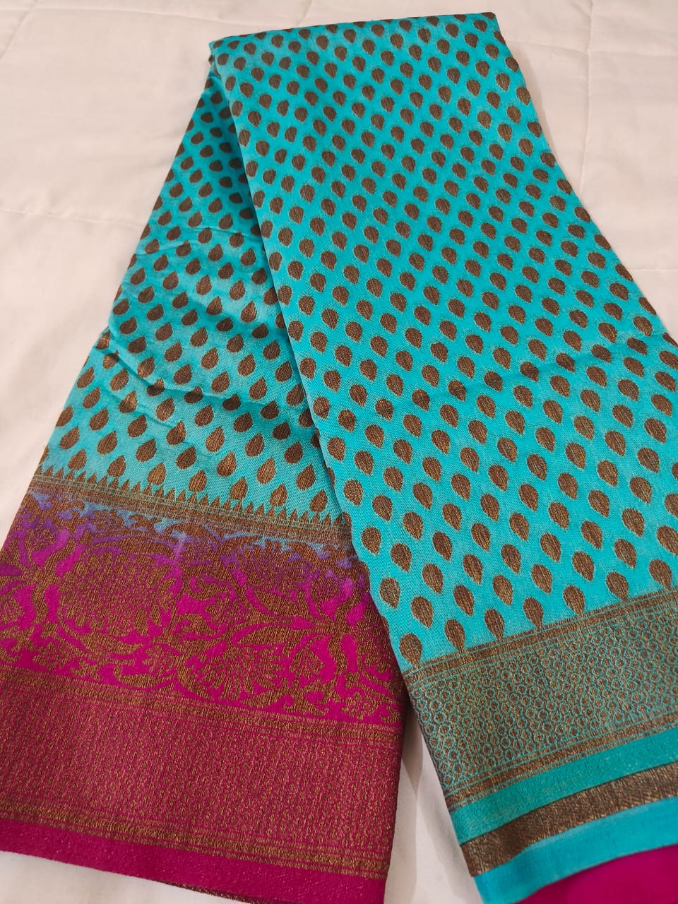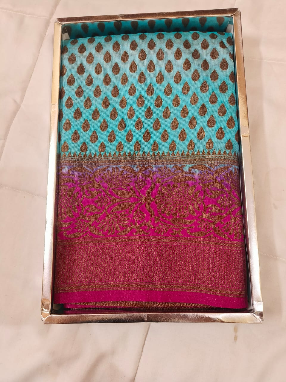 Woven with intricate zari patterns, it reflects timeless craftsmanship.